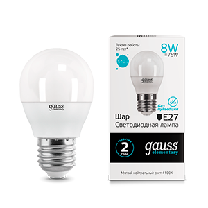 Лампа светодиодная 8 Вт 540 лм 4100К нейтральный белый шар P45 E27 220В от GAUSS - энергосберегающая замена лампам накаливания с равномерным рассеянным светом. Подходит для бытовых и офисных помещений, совместима с большинством стандартных патронов E27.