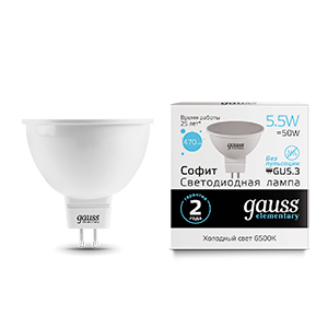 Лампа светодиодная 5.5 Вт 470 лм 6500К холодный белый GU5.3 MR16 220В от GAUSS - компактный источник света с высокой эффективностью, предназначенный для замены галогенных ламп в точечных светильниках. Подходит для бытовых, коммерческих и декоративных систем освещения.