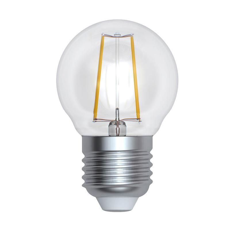 Лампа светодиодная LED-G45 9Вт прозрачная 4000К нейтральный белый E27 Серия Sky от Uniel - энергоэффективная замена классическим лампам накаливания с филаментной конструкцией для освещения жилых помещений, гостиных, спален и кухонь. Артикул ul-00005175 обеспечивает равномерное рассеивание света благодаря шарообразной форме колбы.