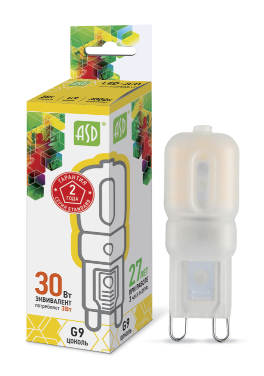 Лампа светодиодная LED-JCD-standard 3Вт капсульная 3000К тепл. бел. G9 270лм 160-260В ASD 4690612003764