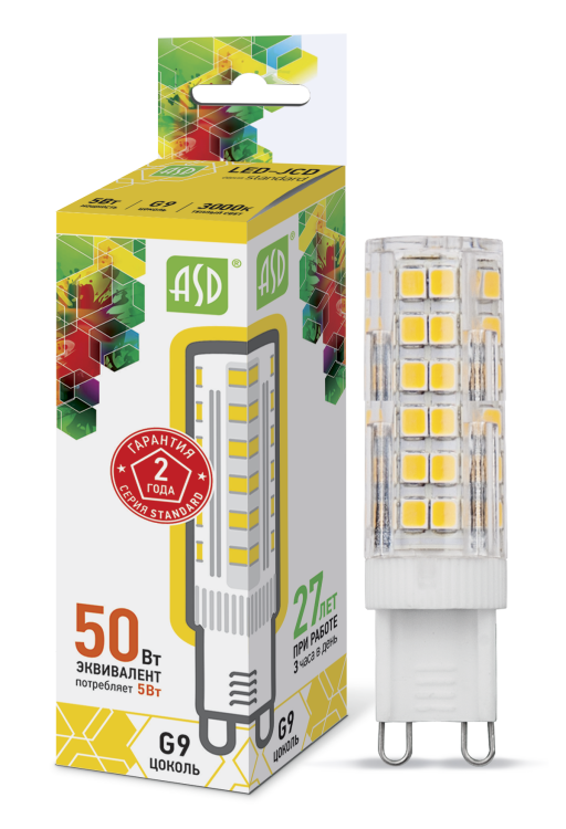 Лампа светодиодная LED-JCD-standard 5Вт капсульная 3000К тепл. бел. G9 450лм 160-260В ASD 4690612004594
