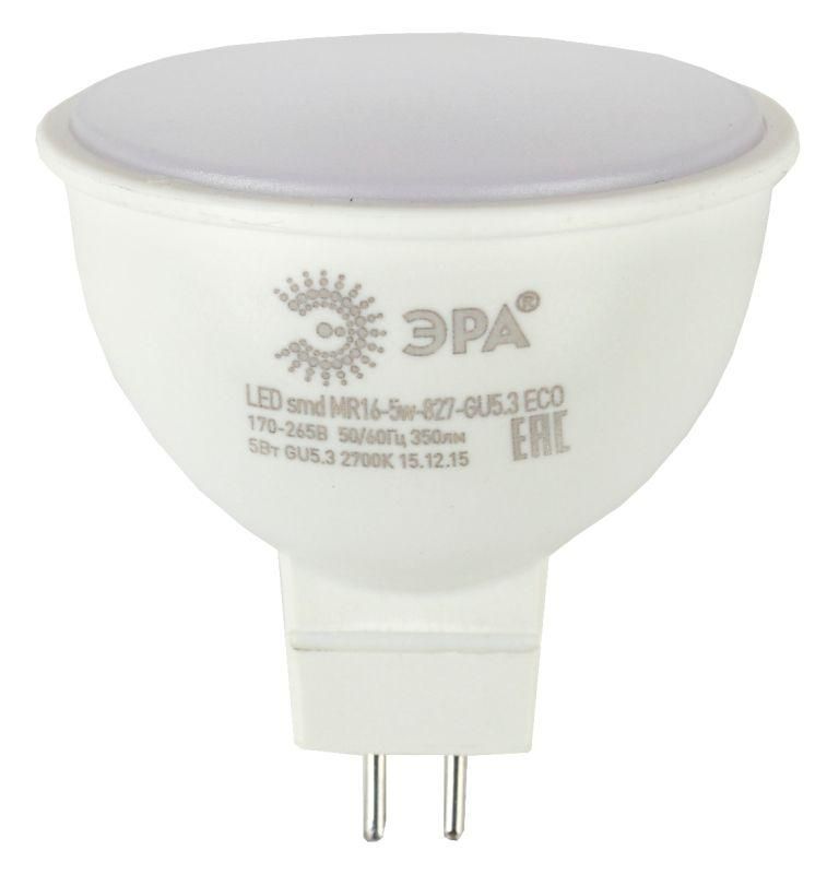 Лампа светодиодная LED 5 Вт 400Лм 2700К теплый белый софит GU5.3 220-240В MR16-5W-827-GU5.3 от бренда ЭРА - компактный источник света с цоколем GU5.3, предназначенный для замены галогеновых ламп в точечных светильниках. Обеспечивает равномерное теплое освещение, потребляет мало энергии и не требует специального обслуживания.