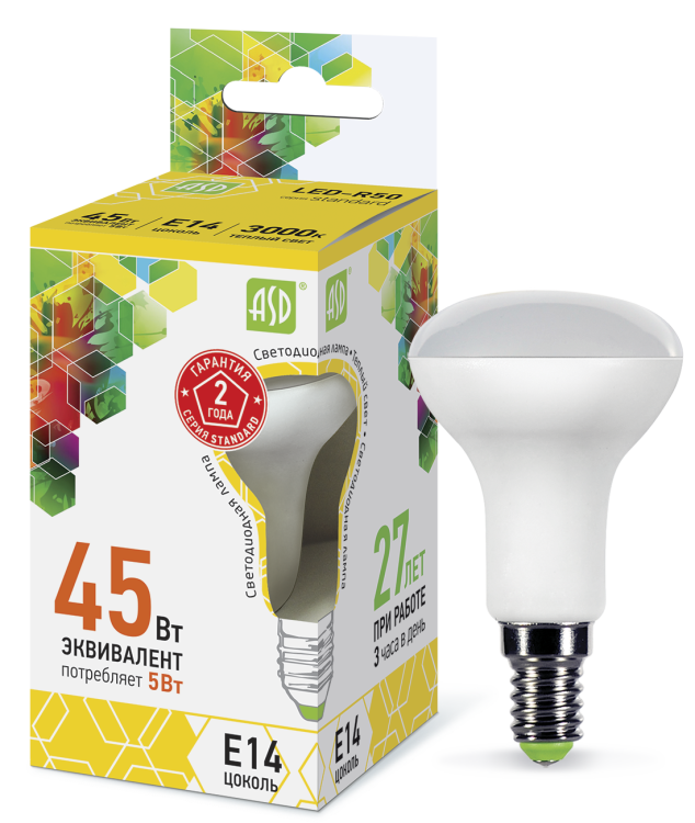 Лампа светодиодная LED-R50 5Вт 230В/160-260В Е14 3000К теплый белый 450Лм от бренда ASD - компактная замена галогенным и лампам накаливания в точечных светильниках. Подходит для акцентного освещения в жилых и общественных помещениях, обеспечивает высокую эффективность при низком потреблении энергии.