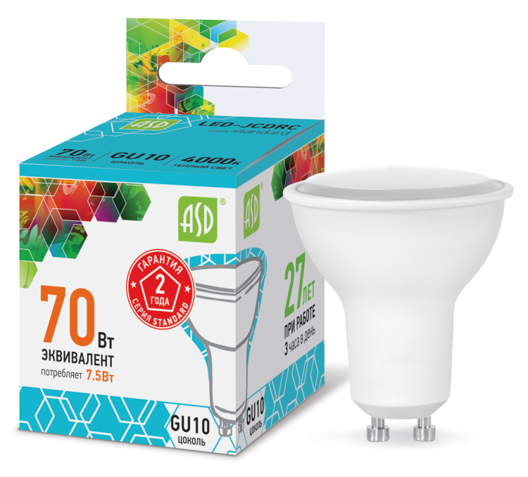 Лампа светодиодная LED-JCDRC-standard 7.5Вт 4000К белый GU10 675лм 160-260В ASD 4690612002323