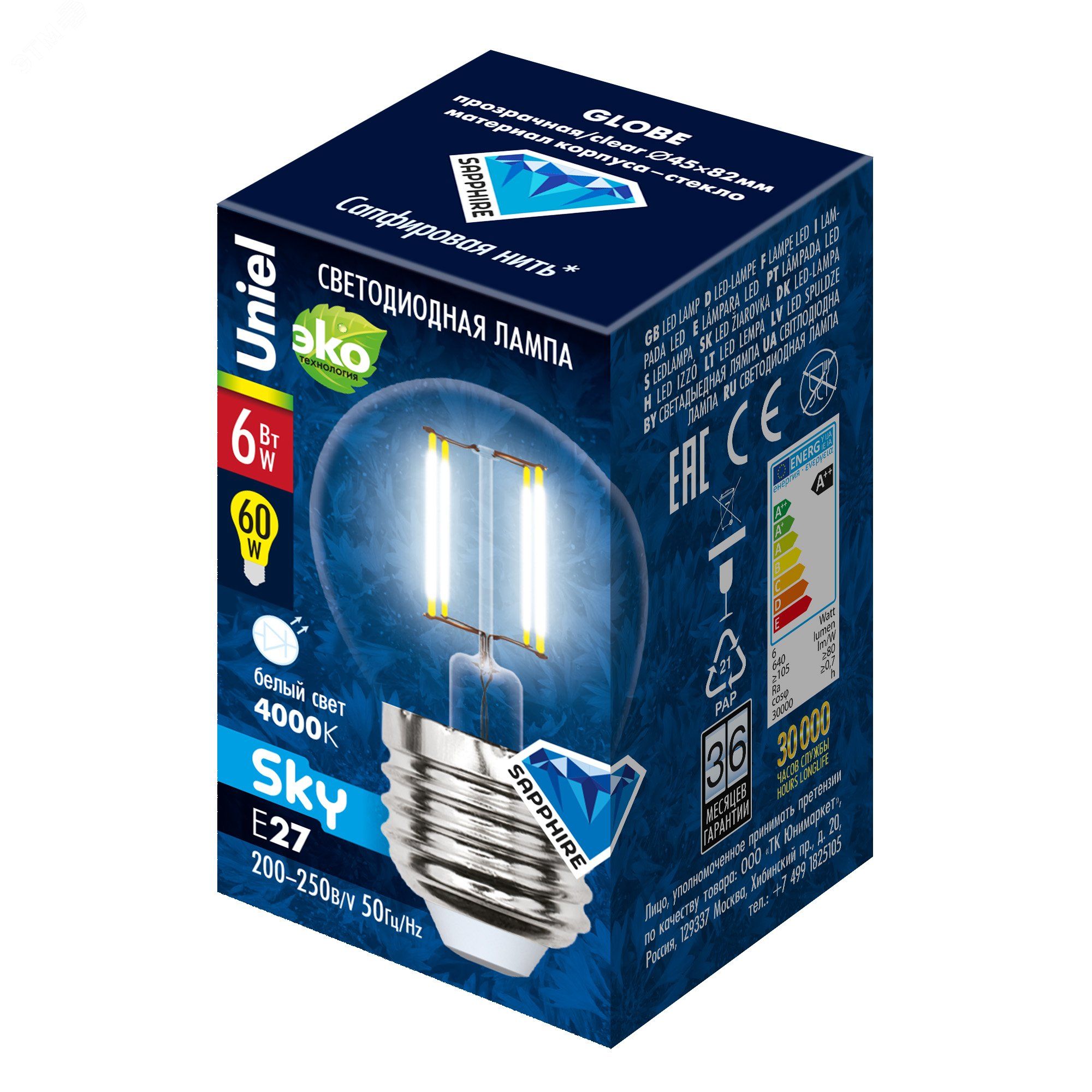 Лампа светодиодная 6 Вт 200-250 В шар прозрачное 500 Лм Е27 4000 К от Uniel (артикул ul-00001370) - энергоэффективная замена лампам накаливания с равномерным свечением благодаря технологии нитиевого излучателя. Подходит для общего и декоративного освещения в жилых и офисных помещениях.