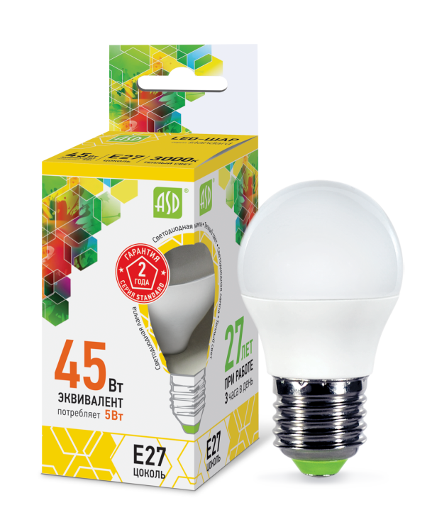 Лампа светодиодная LED-шар-standard 5Вт шар 3000К тепл. бел. E27 450лм 160-260В ASD 4690612002163