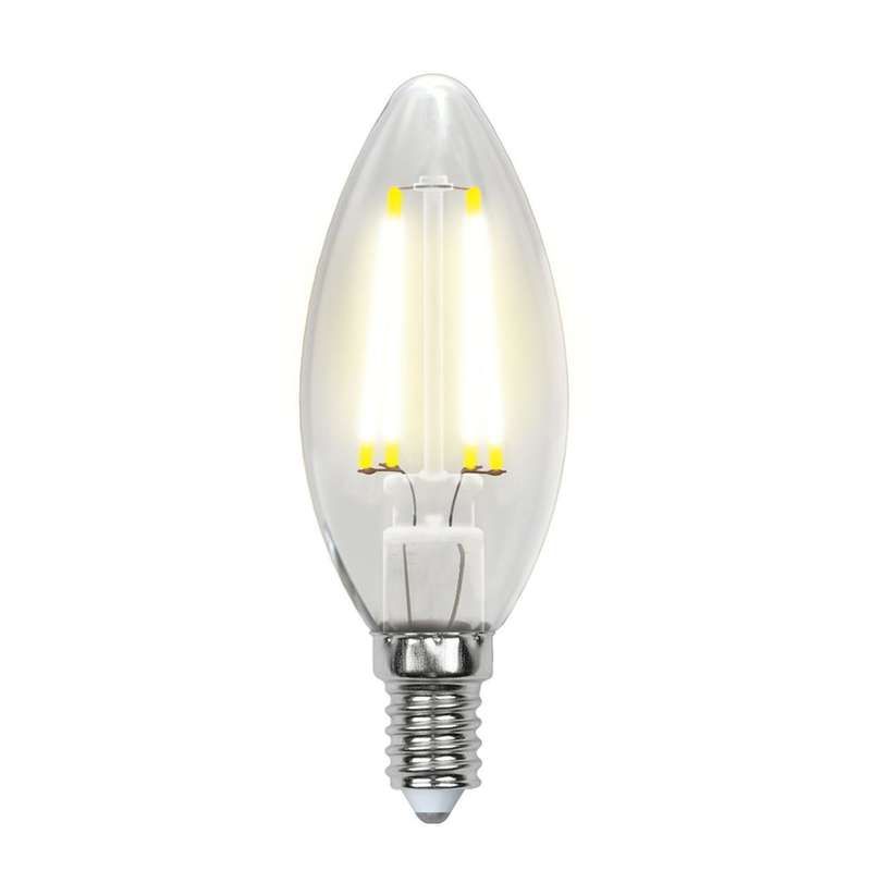 Лампа светодиодная 5 Вт, 200-250 В, теплый белый 3000 К, диммируемая, форма 'свеча', прозрачная, цоколь E14, серия Air - компактный источник света с филаментной технологией, подходящий для декоративного и функционального освещения в бытовых люстрах и светильниках. Бренд Uniel предлагает эту модель под артикулом ul-00002860 как надежную замену классическим лампам накаливания.