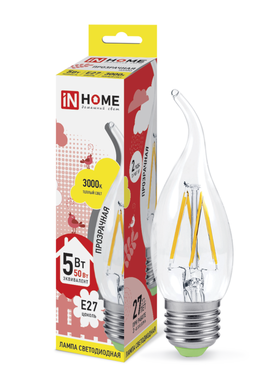 Лампа светодиодная LED-СВЕЧА НА ВЕТРУ-deco 5Вт свеча ветру прозрачная 3000К тепл. бел. E27 450лм 230В IN HOME 4690612007649