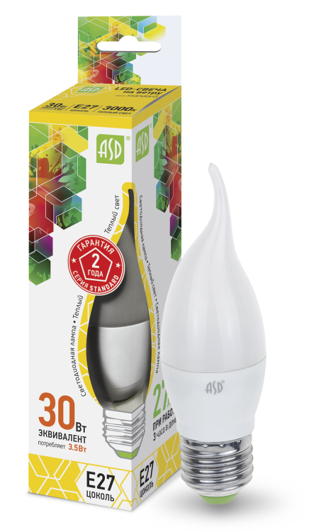 Лампа светодиодная LED-свеча на ветру-standard 3.5Вт свеча ветру 3000К тепл. бел. E27 320лм 160-260В ASD 4690612004754