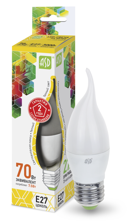 Лампа светодиодная LED-свеча на ветру-standard 7.5Вт свеча ветру 3000К тепл. бел. E27 675лм 160-260В ASD 4690612004570