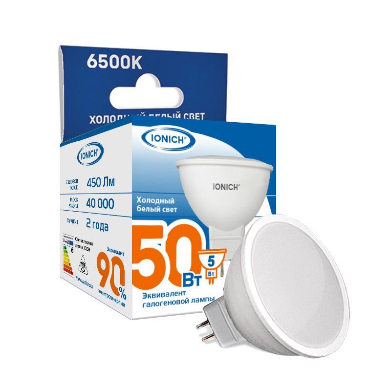 Лампа светодиодная MR16 5Вт 6500К GU5.3 450лм 230В холодный белый от бренда IONICH - компактный источник света для точечного освещения, совместимый со стандартными цоколями GU5.3 и рассчитанный на работу напрямую от сети 230 В. Подходит для замены галогенных ламп в потолочных и настенных светильниках.