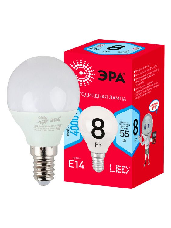 Лампа светодиодная LED 8 Вт 640 Лм 4000К шар нейтральный белый E14 220-240В P45-8W-840-E14 от бренда ЭРА - энергоэффективный источник света с матовой колбой и цоколем E14, подходящий для замены ламп накаливания в бытовых светильниках, бра и настольных ламп.