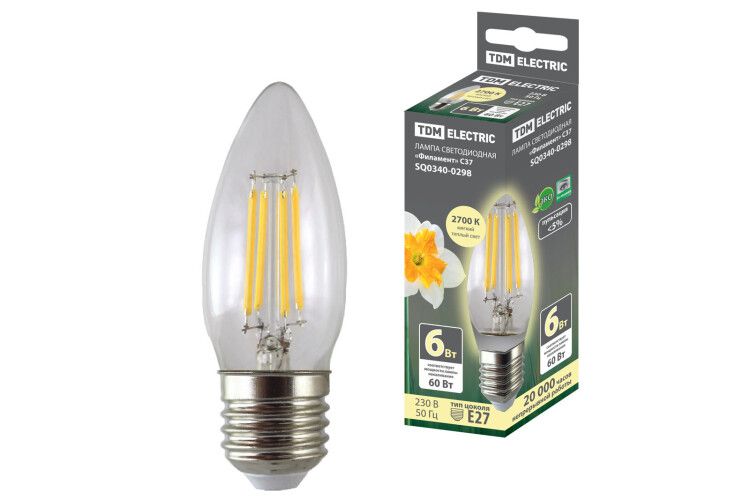 Лампа светодиодная свеча "Филамент" С37-6 Вт-230 В-2700 К–E27 TDM | SQ0340-0298