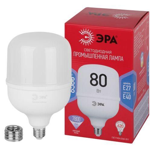 Лампа светодиодная LED 80 Вт 7800 Лм 6500 К T140 холодный белый E27/E40 от бренда ЭРА - высокомощный источник света для крупных помещений, заменяющий лампы накаливания до 620 Вт при потреблении всего 80 Вт. Артикул б0063884 обеспечивает совместимость с распространёнными патронами E27 и E40.