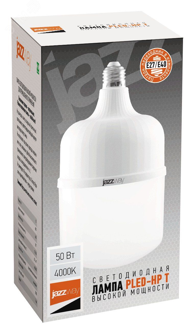 Лампа светодиодная высокомощная PLED-HP-T120 50 Вт 4000 К нейтральный белый E27/E40 (переходник в комплекте) от Jazzway предназначена для замены галогеновых и люминесцентных в помещениях с высокими требованиями к яркости и качеству света. Благодаря компактному дизайну и переходнику между цоколями E27 и E40, она легко адаптируется под существующие светильники.
