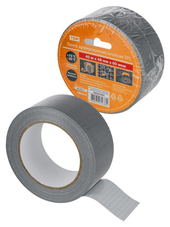 Лента армированная клейкая TPL, серебристая, 48 мм х 40 м TDM | SQ0526-0903 ELECTRIC - это универсальный материал, который предназначен для герметизации и гидроизоляции швов, стыков труб, панелей и других поверхностей. Она изготовлена из синтетического каучука и полиэтиленовой пленки, которая армирована полиэфирной сеткой.