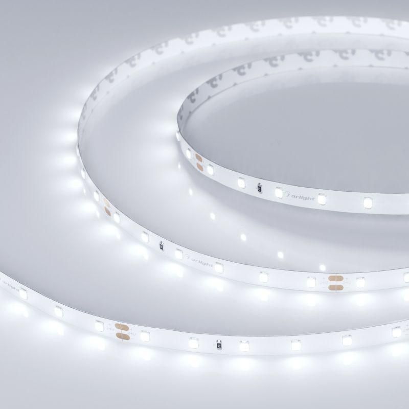 Светодиодная лента Arlight RT-A60-8мм 24V Day5000 CRI98 4.8 Вт/м IP20 2835 5м - это яркая, точного белого света лента с высокой цветопередачей, подходящая для профессионального освещения интерьеров, где важна естественная передача цветов. Лента поставляется бухтами по 5 метров, но легко режется на участки по 100 мм.