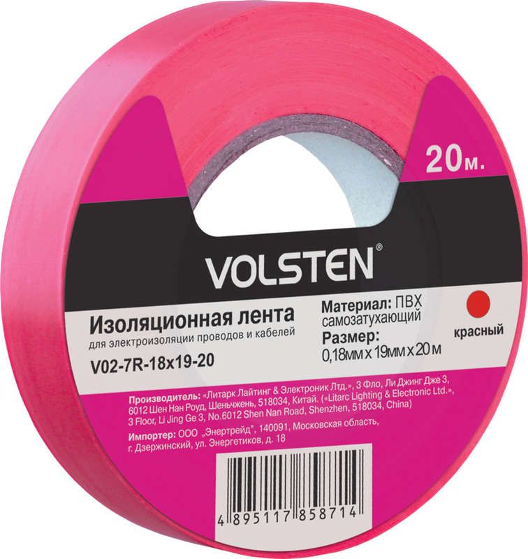 Изолента V02-7R-18х19-20 0.18х19мм (рул.20м) красн. Volsten 9787 - это специальная изолирующая лента, предназначенная для использования при изоляции электрического кабеля при его соединении или повреждении изоляционного покрытия.