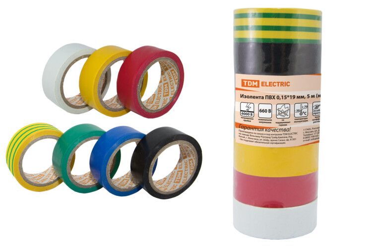 Изолента ПВХ 0,15*19 мм 5 м (набор 7 цветов) от TDM ELECTRIC - самоклеящаяся изоляция из поливинилхлорида для надёжной защиты и маркировки электропроводов в бытовых, промышленных и строительных условиях.