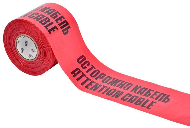 Лента сигнальная ЛСЭ-450 'Осторожно кабель' от IEK - красная плёнка из полиэтилена с предупредительной надписью, предназначенная для маркировки и поверхностных кабельных трасс, чтобы избежать случайного повреждения при земляных работах. Бухта длиной 100 метров позволяет эффективно использовать её на крупных объектах.