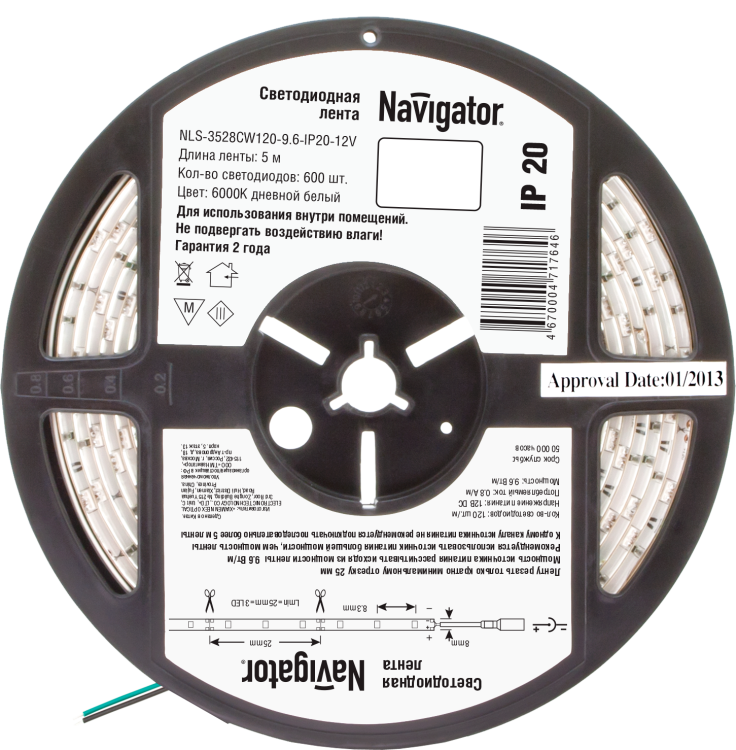Лента светодиодная 71 764 NLS-3528CW120-9.6-IP20-12V R5 работает с блоками питания 12 В постоянного тока. Убедитесь, что мощность блока превышает суммарную потребляемую мощность всей ленты минимум на 20%. Например, для 5 метров (48 Вт) выбирайте блок на 60 Вт и выше. Разрезать ленту можно каждые 5 см - есть отметки с надписью “cut”. Для соединения используйте коннекторы или пайку. Крепление осуществляется через самоклеящийся слой с трёхмерным скотчем 3M - перед установкой поверхность должна быть чистой и сухой.