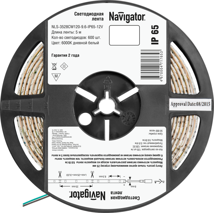 Лента светодиодная NLS-3528CW120-9.6-IP65-12V R5 9.6 Вт/м 12 В 6000 К IP65 5 м - это самоклеющаяся белая LED-лента с цветовой температурой 6000 К, предназначенная для акцентной подсветки внутри помещений и на улице. Бренд Navigator предлагает эту модель как надежный и энергоэффективный вариант для коммерческого и бытового освещения.