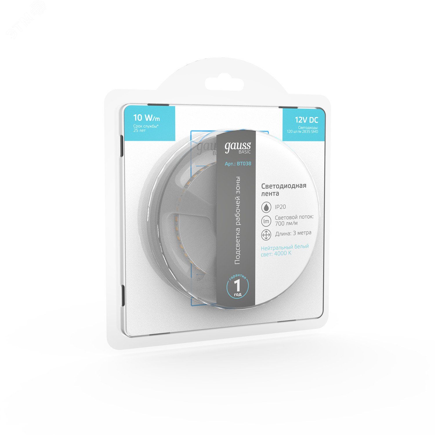 Лента светодиодная LED 10 Вт/м 700 Лм/м 2835-SMD 120 шт/м 12 В DC 4000К нейтральный белый IP20 блистер (3 м ) Basic Gauss - BT038