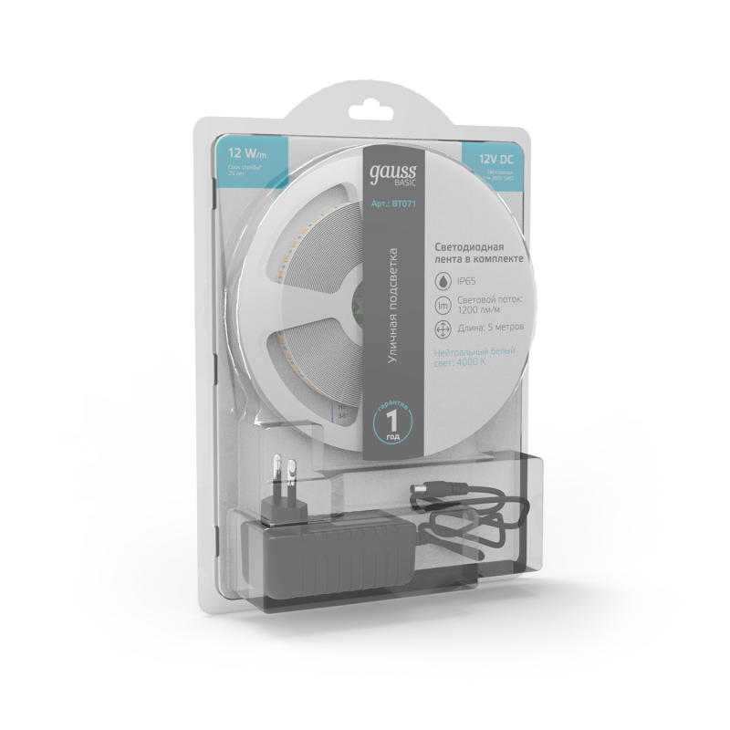 Лента светодиодная 2835/120-SMD 12 Вт/м 1200 лм/м 4000К нейтральный белый IP65 12В 8мм комплект лента и драйвер 5м от GAUSS - готовое решение для равномерного и надежного освещения интерьеров и фасадов. В комплекте уже есть драйвер и все необходимые элементы для быстрого подключения - достаточно просто закрепить ленту и включить в сеть.