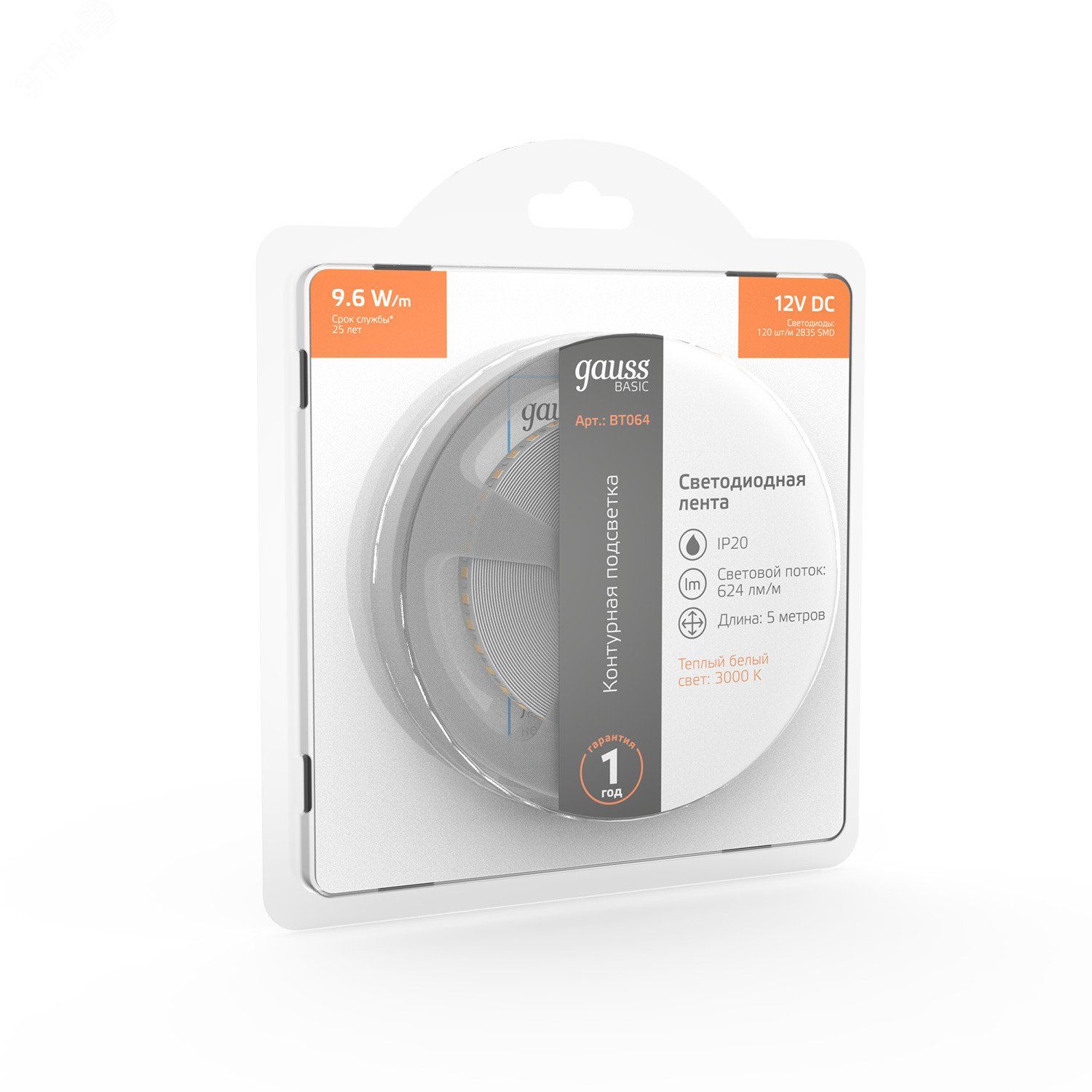 Лента светодиодная LED 9,6 Вт/м 624 Лм/м 2835-SMD 120 шт/м 12 В DC 3000К теплый белый IP20 блистер (5 м ) Basic Gauss - BT064