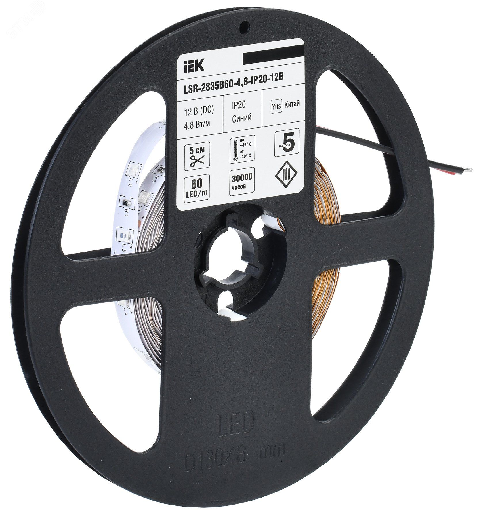 Лента светодиодная 5м LSR-2835B60-4,8-IP20-12В от IEK - это самоклеящаяся синяя лента с плотностью 60 светодиодов на метр, предназначенная для декоративной подсветки интерьеров при напряжении 12 В постоянного тока. Артикул lsr1-7-060-20-3-05 соответствует серии LIGHTING и подходит для установки в сухих помещениях.