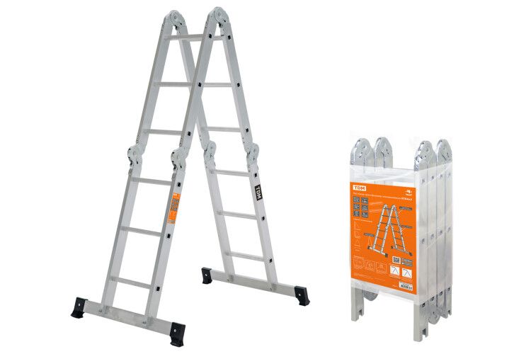 Лестница-трансформер ЛТА4х3 состоит из 4 секций по 3 ступени, что обеспечивает высоту до 3.3 метров. Она изготовлена из прочного алюминия, что делает ее легкой и удобной в использовании. Несущая способность составляет 120 кг, что позволяет безопасно работать на лестнице.