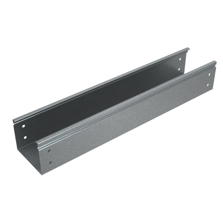 Лоток не оснащен встроенными замками или защелками. Соединение между секциями выполняется с помощью соединительных пластин (не входят в комплект). Борта лотка завальцованные - края загнуты на 180°, чтобы предотвратить порезы кабелей при проходе через край. Монтаж осуществляется на кронштейны, подвесы или крепления к стене/потолку. Рекомендуемый шаг опор - до 1,5 метра при равномерной нагрузке. Для герметичности и защиты от пыли и влаги используйте крышки серии PLUS, совместимые по габаритам.