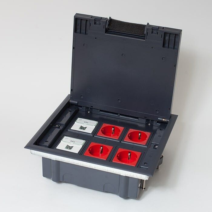 Люк на 6 постов (45*45) металл/пластик с пластиковой коробкой IP40 | 300006 SPL - это удобное решение для организации рабочих мест в помещениях с открытым пространством, где невозможно разместить рабочие столы рядом со стенами. Этот люк обеспечивает удобный доступ к силовым и информационным розеткам.