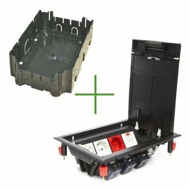 Люк в пол на 8 постов с суппортом и коробкой (45х45 мм), пластик совместим с любыми стандартными модульными устройствами, соответствующими DIN 43880. Монтаж выполняется в предварительно вырезанную нишу в бетонной стяжке или плитке. Суппорт фиксирует коробку в нужном положении до заливки раствора. Крышка открывается без инструментов - достаточно поддеть край. Убедитесь, что толщина полового покрытия не менее 10–15 мм над крышкой для равномерного распределения нагрузки.