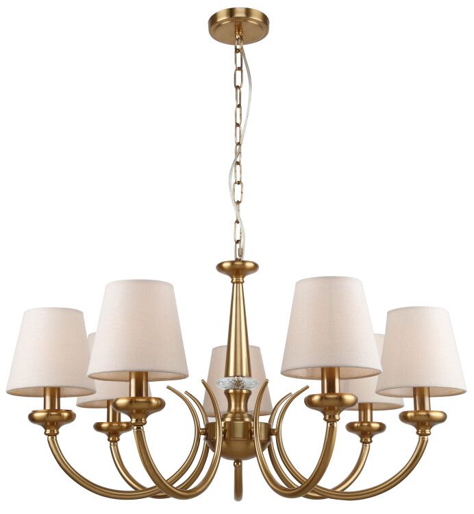 Люстра Rivoli Carissa (арт. 2073-307) - семирожковый потолочный светильник с тканевыми плафонами, предназначенный для создания мягкого равномерного освещения в жилых помещениях. Модель сочетает классический дизайн, надежную стальную конструкцию и совместимость с лампами накаливания E14, что делает её удобным решением для гостиных, спален и загородных домов.