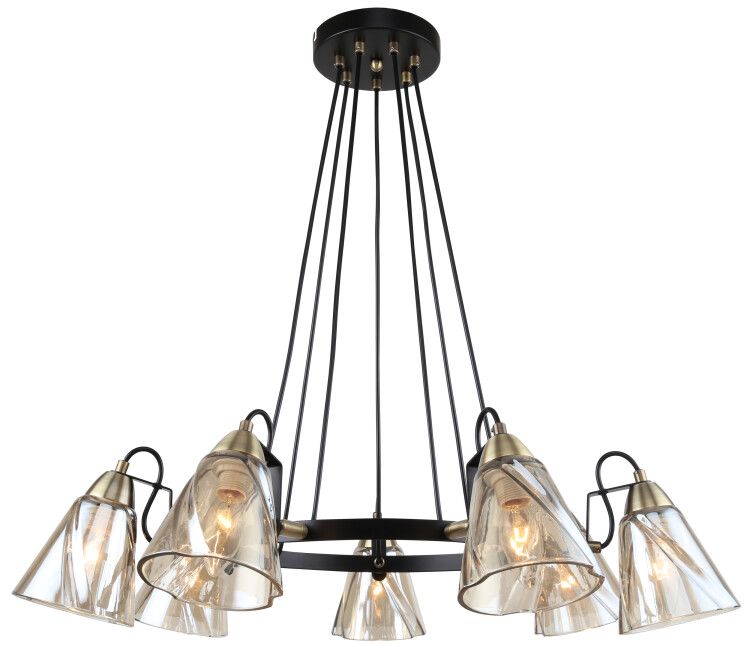 Люстра 7 ламп E14 40 Вт лофт-кантри от Rivoli (артикул б0055516) - это потолочный светильник с семью стеклянными плафонами, предназначенный для создания уютного, рассеянного освещения в жилых помещениях. Металлический черный корпус и теплая тонировка стекла обеспечивают стильный вид, подходящий для интерьера в стилях лофт-кантри и современной классики.