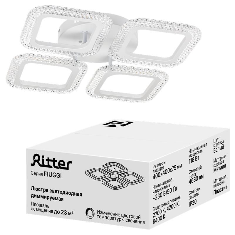 | Люстра потолочная светодиодная диммируемая FIUGGI 400х400х75мм 118Вт 2700К/4200К/6400К 23кв.м бел. Ritter 52167 3 | 13.03.2026 | 282 шт. | 2 189,82 ₽ | шт. | от 10 дней |
