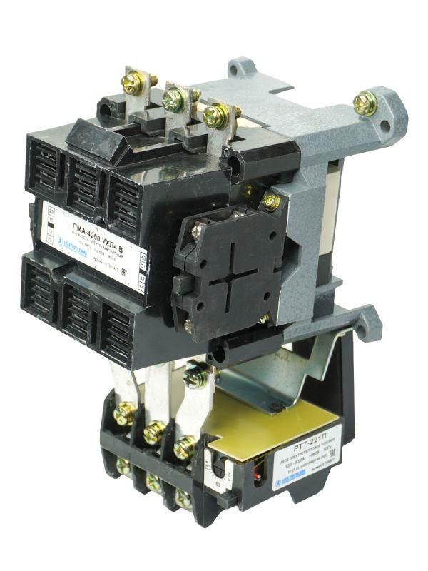 Встроено реле РТТ-221П, которое защищает двигатель от перегрузки, перекоса фаз, длительного пуска и заклинивания ротора. Это делает ПМА-4200 УХЛ4 В полноценным пускателем с термической защитой, а не просто контактором.