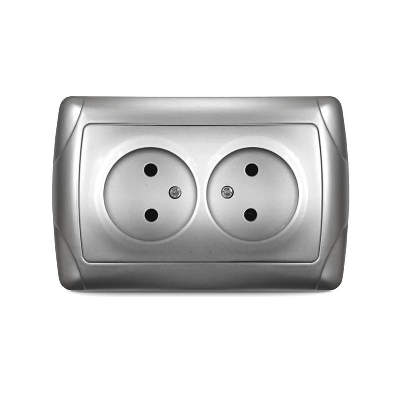 Розетка двухместная без заземления, с europlug, 16А, 220В, серебристая используется там, где не требуется защитное заземление - например, для питания маломощной техники: зарядных устройств, светильников, телевизоров, компьютеров, фенов и других устройств класса II. Применяется в квартирах, гостиницах, офисах и других закрытых помещениях с контролируемой средой. Не подходит для мощного оборудования типа стиральных машин, духовых шкафов или водонагревателей.