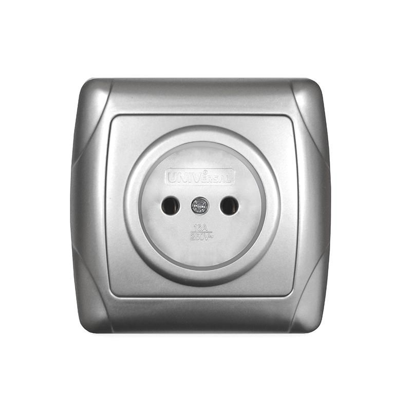 Розетка одноместная без заземления 16А 220В серебристая (еврослот) от бренда Universal, артикул м0022-s, предназначена для подключения бытовых приборов в помещениях с низкими требованиями к защите от поражения током. Относится к серии Маргарита - надёжные решения для скрытой проводки.