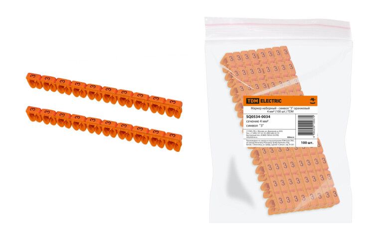 Маркер наборный TDM ELECTRIC sq0534-0034 - это пластиковый маркер с оранжевой цифрой «3» для идентификации проводов с сечением 4 мм2. Комплект из 100 штук предназначен для быстрой и надёжной маркировки кабелей в электрощитах, промышленном оборудовании и системах электроснабжения.