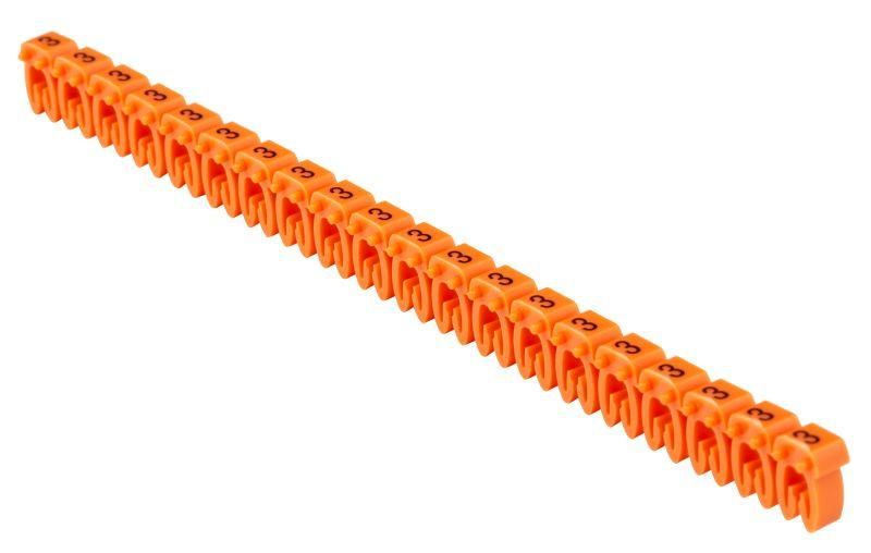 Маркер кабельный открытого типа KE 0,75–1,5 мм2 символ «3» устанавливается методом защёлки - достаточно вставить кабель в прорезь и закрыть крышку. Нет необходимости перекручивать, резать или использовать клей. Монтаж возможен даже на уже смонтированных проводах. Подходит для медных и алюминиевых жил с указанным диаметром. Не совместим с кабелями толще 3 мм - попытки насильственной установки повредят материал.