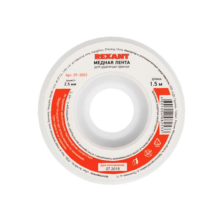 Медная лента для удаления припоя диаметр 2.5 мм, длина 1.5 м от REXANT - это инструмент для точечного удаления припоя с печатных плат без повреждения выводов компонентов. Подходит для ремонта, доработки и перепайки SMD и THT элементов.