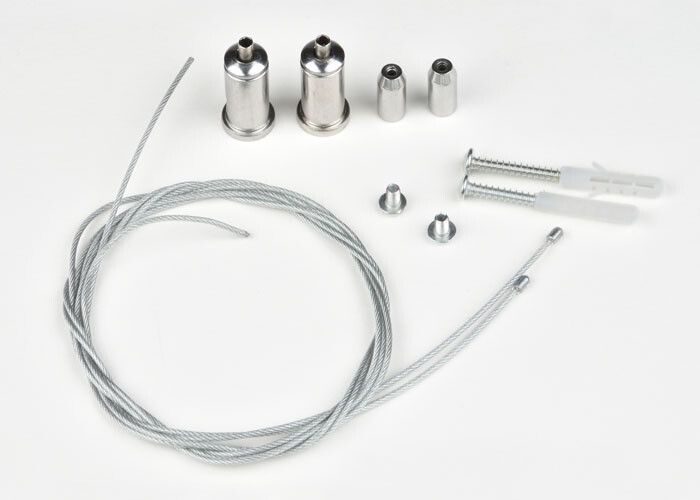 Комплект UFL-H02 совместим со всеми накладными светильниками, имеющими стандартный крепёжный проушиной или отверстием для подвеса диаметром до 5–8 мм. Каждый трос имеет защёлкивающиеся крепления на обоих концах - один закрепляется на потолочном крюке или анкерном болте, второй - на корпусе светильника. Для монтажа достаточно продеть трос через отверстие и зафиксировать замком. Установка не требует специальных инструментов - достаточно рук.