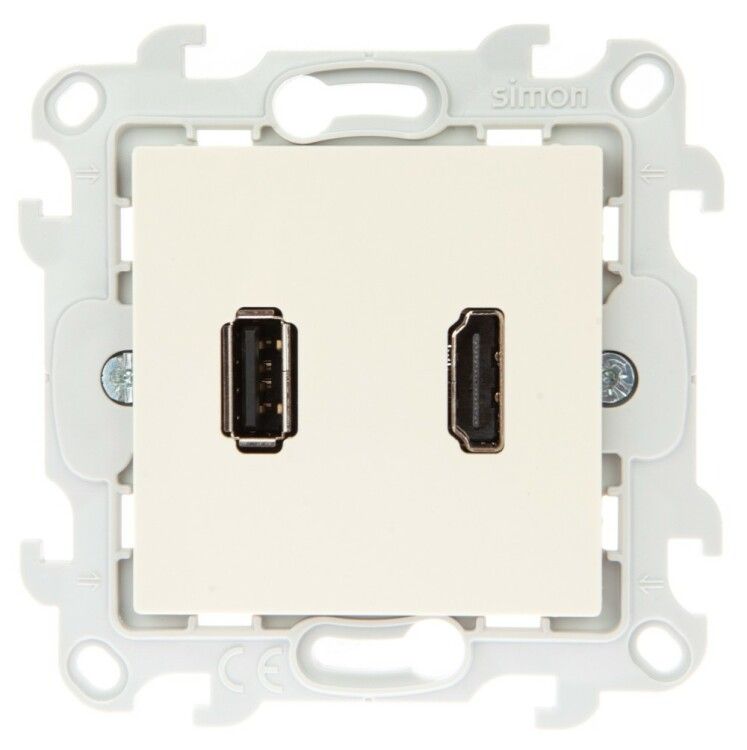 Коннектор HDMI+USB 2.0, цвет слоновая кость от бренда Simon с артикулом 2411095-031 - это комбинированная розетка, объединяющая в одном корпусе разъём HDMI и порт USB 2.0 для подключения медиаустройств и зарядки гаджетов. Подходит для установки в жилых и офисных помещениях со скрытым монтажом.