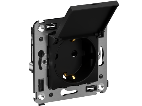 Розетка с крышкой в стену, 2 модуля, 2P+E, с защитными шторками, черный матовый, 16А от бренда DKC (ДКС), артикул 4412013, предназначена для безопасного подключения бытовых и профессиональных устройств в помещениях с повышенными требованиями к эстетике и безопасности. Модель из серии Avanti совмещает надежную конструкцию, защитные функции и минимализм дизайна.