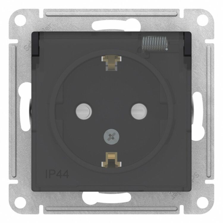 Розетка с заземлением со шторками с прозрачной крышкой, 16А, IP44, механизм, цвет карбон от Systeme Electric (артикул atn441046) - это защищённый модуль для безопасного подключения бытовой техники в условиях повышенной влажности, таких как ванные комнаты и кухни.