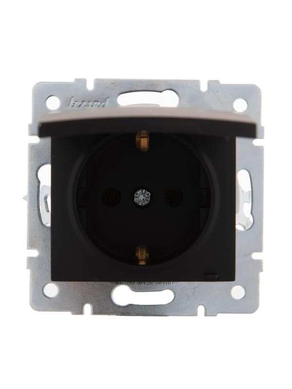 Розетка с заземлением Lezard KARINA (арт. 707-4288-123) - скрытая однопостовая розетка с защитной крышкой и черным бархатистым покрытием, предназначенная для надежного подключения бытовых приборов с заземлением в помещениях с умеренным климатом.