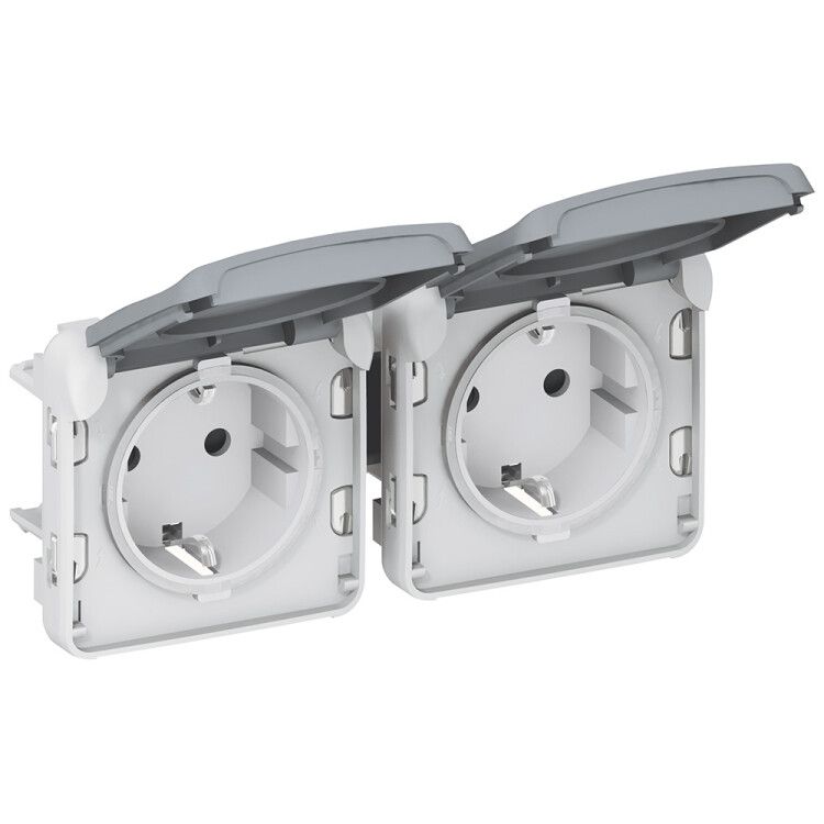 Розетка 2-м СП Plexo 16А IP55 горизонт. 2х2P+E с заземл. крышкой немецк. стандарт механизм сер. Leg 069576 Legrand