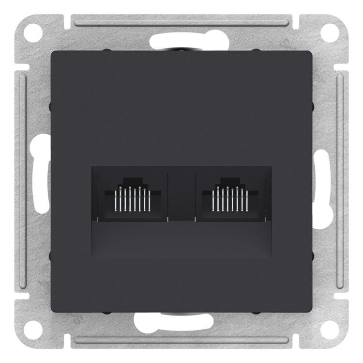 Розетка компьютерная двойная RJ45+RJ45, категория 5E, механизм, цвет карбон, SE - это механизм без лицевой пластины. Для полноценной установки требуется совместимая рамка серии AtlasDesign. Крепится в монтажную коробку с помощью усиленных лапок: две фиксируются враспор, две - на саморезы. Это гарантирует жёсткую посадку даже в старых или немного увеличенных отверстиях. Наличие сальника позволяет герметично вводить кабель, предотвращая его перегибы.